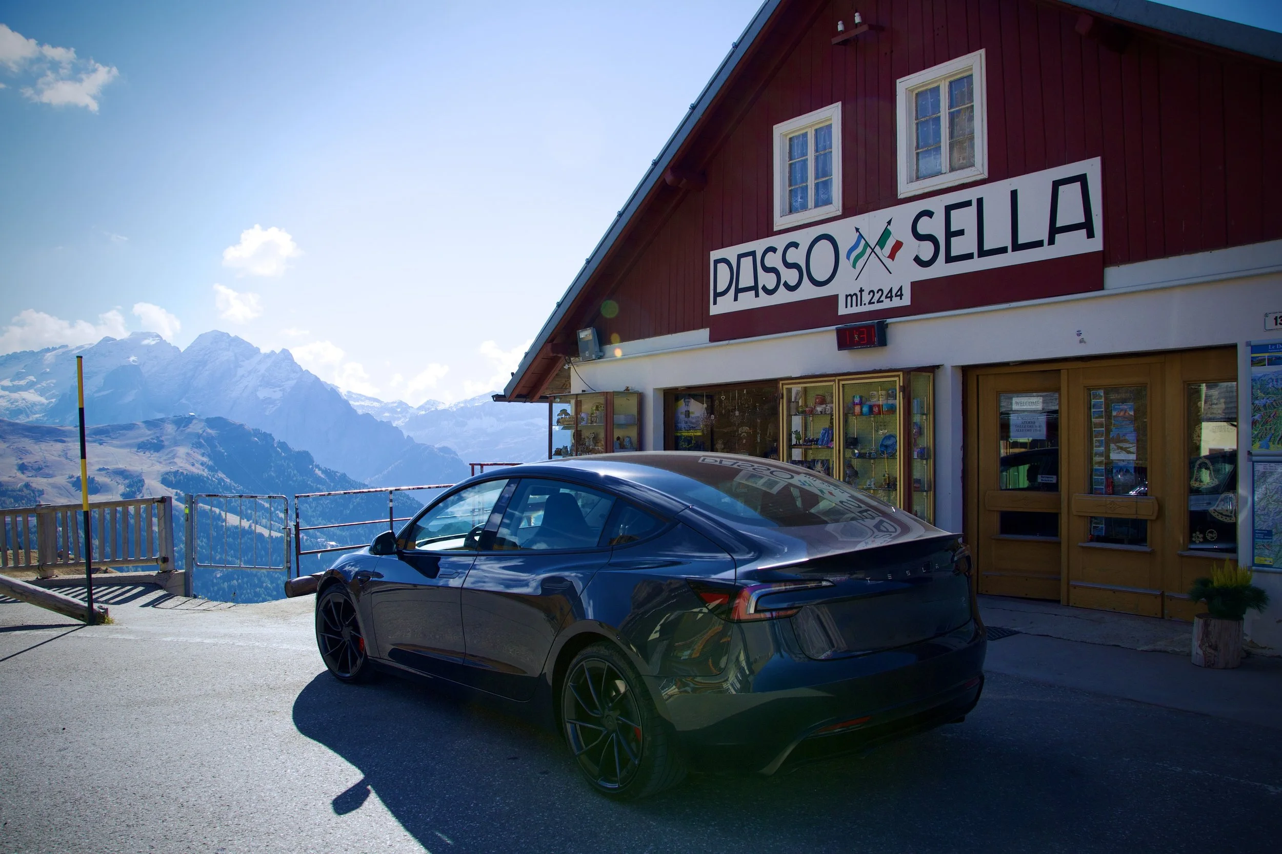 La macchina era carica al 70% alla partenza, ma arrivati a Bolzano abbiamo preferito una ricarica veloce ala supercharger, giusto perché in quota non ero sicuro di trovare qualcosa, ma soprattutto la grande rete di ricarica di Elon Musk. Sono decisamente più convenienti per chi guida americano. Ammetto che è molto peculiare affrontare 5 passi dolomitici scaricando l’auto in salita, ma ricaricando in discesa, Non recuperi tutto, ma ci ha permesso di affrontare il circuito in totale serenità. una volta usciti da Bolzano, ho sbagliato strada (colpa mia, e abbiamo fatto come dire, il giro largo. Siamo passati da Fié allo Scillar abbiamo proseguito sul passo Pinei 1437 s.l.m verso Ortisei, e di fatto ripreso la strada maestra.
