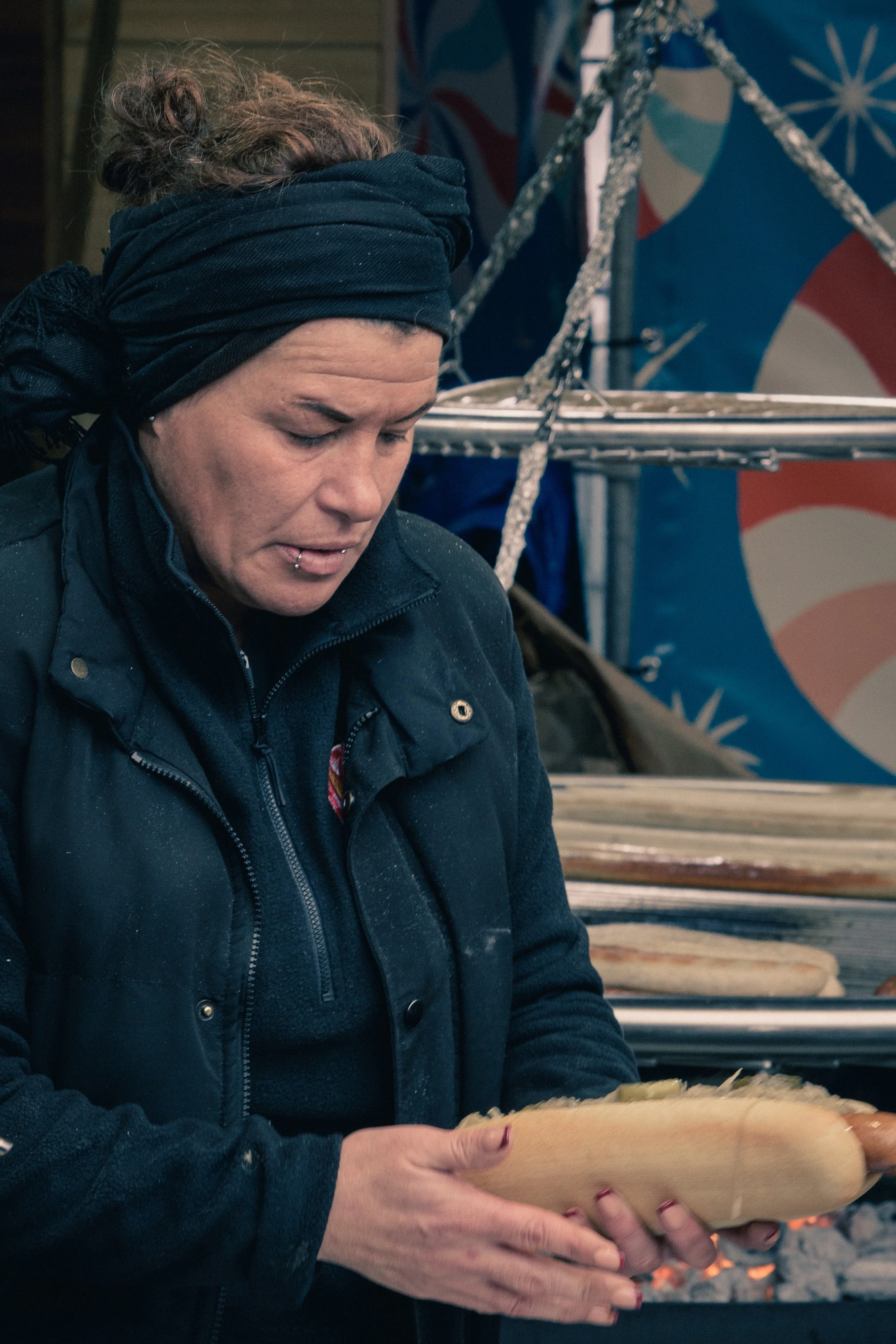 Come quello di una donna intenta a preparare e consegnare un delizioso panino con salsiccia agli aromi.