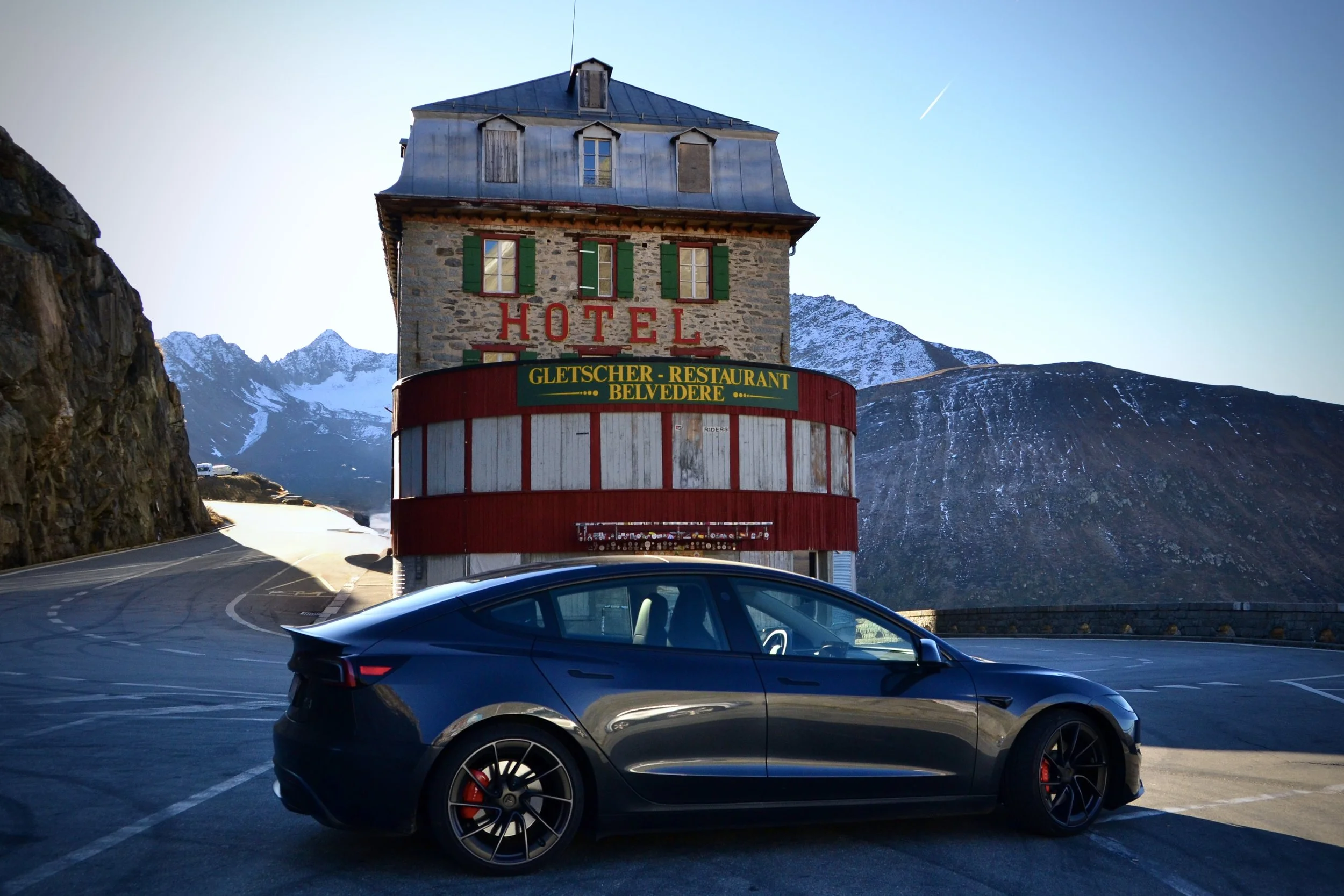 Mentre completavo i dovuti omaggi al luogo, sento scendere dalla montagna due auto magnifiche e non proprio originali, Una M3 Berlina seguita da una M2 seconda serie. Ho piacevolmente notato che da queste parti, ogni proprietario di auto sportiva viaggia da solo, pensavo di essere io pazzo, ma vedo che qua sono in buona compagnia. Certo io sono andato in gita con la moglie, ma l’obiettivo di giornata non era certo andare a manetta sulle strade svizzere, ma quello di rilassarmi nella speranza di qualcosa da fotografare. E con immenso piacere posso dire di essere stato fortunato. In cima al Furkapass però, al mio passaggio nessuna bella auto, solo camper al bivacco. Non mi sono soffermato molto in vetta, giusto due scatti e poi giù verso il Belvedere. Sono anni che sogno di arrivarci in qualche modo, ma il tempo tiranno e spesso sono tirato con il lavoro, non concedendomi mai momenti di relax come questo. Ovviamente arrivato di fronte all’hotel, ho piazzato l’auto meglio che ho potuto per rubare due scatti, c’era la coda. Prometto che la prossima volta che approderò al Furka, lo farò al mattino molto presto, cosi da garantirmi un’ottima luce e una vista tutta per me. Si riparte, e prima del tornate c’è un piccolo spazio sulla destra dove mi fermo per verificare che le foto non siano mosse, ho scattato a mano libera e visto che non ero lontano, sarei tornato in un balzo. Mente verifico e mi rassereno, vedo sbucare dalla curva una magnifica “Lancia Delta Integrale Martini Racing”, seguita a ruota da una “Porsche GT4 grigio gesso”. Due epoche diverse e due auto diverse, per stile e segmento, ma di pari fascino. All’angolo vedo un ragazzo seduto su una roccia che scatta a tutte le supercar che transitano di là, poi rivenderà le foto online. Ne ho comprata una anch’io sulle Stelvio qualche anno fa.